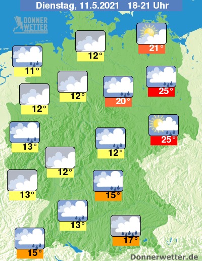 Heute Abend bleibt es über der Bundesrepublik weitgehend bedeckt und es fällt auch gebietsweise Regen. In den östlichen Landesteilen sowie vom Niederrhein bis zur Ems bleibt es größtenteils trocken. Die Temperatur liegt bei 11 Grad an der Nordseeküste und bis 25 Grad in der Lausitz.