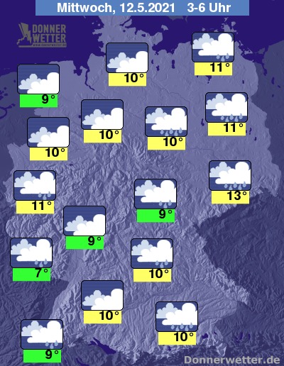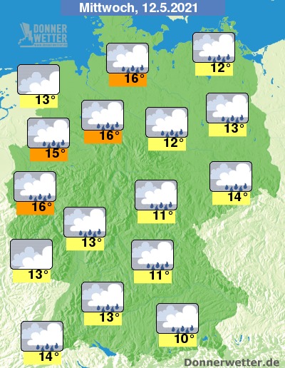 Am Mittwoch halten sich im Land dichte Wolken, dabei fällt über der Südhälfte zeitweise, im übrigen Land fällt gelegentlich Regen. Die Temperatur steigt auf kühle 10 Grad in Berchtesgaden und bis 16 Grad im Norddeutschen Tiefland.