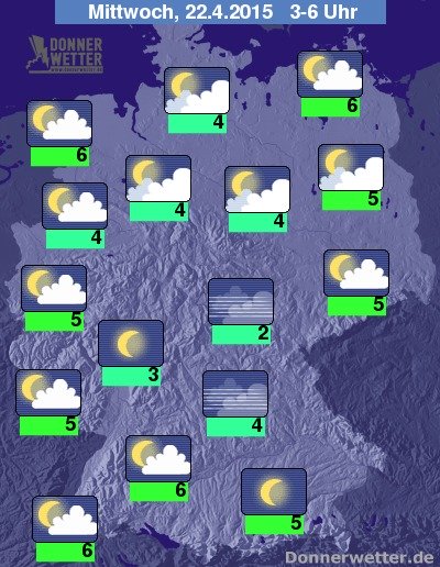 In der bevorstehenden Nacht ist es oft noch sternenklar, im Nachtverlauf ziehen aber besonders im Norden auch teils einige Wolken auf, dazu bleibt es weitgehend trocken. Weiter nach Süden hin sind nur lockere Wolken möglich, dazu bleibt es trocken. Die Tiefstwerte erreichen 6 Grad im Oberrheingraben und 2 Grad im Coburger Land.