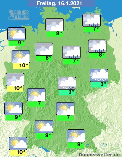 Am Freitag bleibt es im Osten und Nordosten bedeckt und es fällt gebietsweise Regen, zum Teil auch Schnee. Im übrigen Land ist es oft stark, teils aufgelockert bewölkt. Im Süden ist es vielerorts heiter, dabei bleibt es trocken. Die Temperatur steigt auf teils nur 3 Grad in der Lausitz und bis 10 Grad am Niederrhein.
