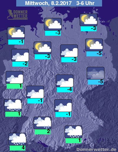 In der Nacht zum Mittwoch lockert und klart der Himmel im Norden und Osten über weite Strecken auf, hier bleibt es weitgehend trocken. Dagegen bringen dichte Wolken dem Süden und Südwesten zeitweiligen Regen, Schneeregen oder Schnee, dabei ist Glätte möglich! Im übrigen Land ist es stark bewölkt, aber meist trocken. Die Temperatur sinkt auf 4 Grad in Freiburg und bis -5 Grad in Dresden.