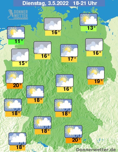 In der Nacht zum Mittwoch ist es im Süden oft dicht bewölkt und es bilden sich vor allem bis Mitternacht noch vielerorts Schauer und selten auch Gewitter, jedoch lockert es hier im Nachtverlauf meist auf und die Niederschläge klingen weitgehend ab. Im übrigen Land ist es verbreitet gering bis aufgelockert, im Osten auch oft stark bewölkt, dazu bleibt es trocken. Die Temperatur sinkt auf 10 Grad in Stuttgart und 3 Grad in Neubrandenburg.