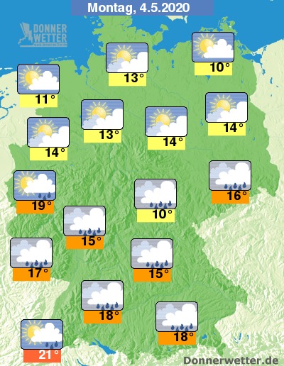 Am Montag ist es zum Teil aufgelockert, besonders über der Südhälfte jedoch oft stark bewölkt. Es bleibt über dem Norden weitgehend trocken, während sich sonst wiederholt einzelne Schauer bilden können. Die Temperatur steigt auf 10 Grad in Stralsund und bis 21 Grad in Freiburg.