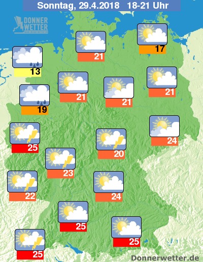 Heute Abend ziehen in den westlichen Landesteilen verbreitet kompakte Wolken auf, dabei sind teils kräftige Schauer und örtlich auch Gewitter möglich. Weiter nach Osten hin ist es hingegen oft heiter, teils auch noch aufgelockert bewölkt, dabei sind nur ganz vereinzelt Schauer oder Gewitter möglich. Die Temperatur liegt bei 13 Grad direkt an der Nordsee, sonst zwischen 17 und 25 Grad.