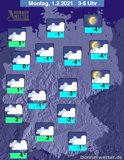 In der folgenden Nacht zieht es sich auch im Norden und Osten immer weiter zu, teils ist es aber auch noch aufgelockert bewölkt, dazu bleibt es trocken. Im übrigen Bundesgebiet ist es schon dicht bewölkt und im Laufe der Nacht zieht von Südwesten her Regen, Schneeregen oder Schnee auf, der gegen Morgen in etwa die Südwesthälfte des Landes umfasst. Die Temperatur sinkt auf 4 Grad am Oberrhein und bis -4 Grad im Westhavelland.