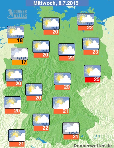 Am Mittwoch scheint vor allem über der Osthälfte mit Ausnahme der südlichen Landesteile häufig die Sonne und es bleibt trocken. Auch im Südwesten ist es zumindest anfangs oft heiter und trocken. Sonst zieht hingegen meist wechselnde oder auch starke Bewölkung durch und es bilden sich zeitweise Schauer, am Alpenrand und im Nordseeumfeld gebietsweise auch Gewitter. Die Temperatur steigt nur noch auf 17 Grad am Niederrhein und bis etwa 25 Grad in Niederschlesien.