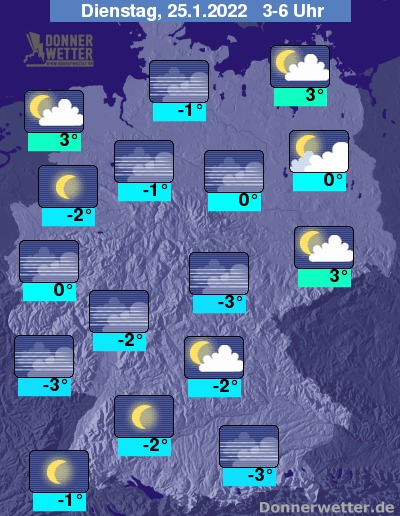 In der Nacht zum Dienstag ist der Himmel verbreitet sternenklar, hier und da bildet sich jedoch Nebel. Es bleibt überall trocken bei Tiefstwerten von 3 Grad in Cuxhaven und bis -3 Grad in Augsburg.