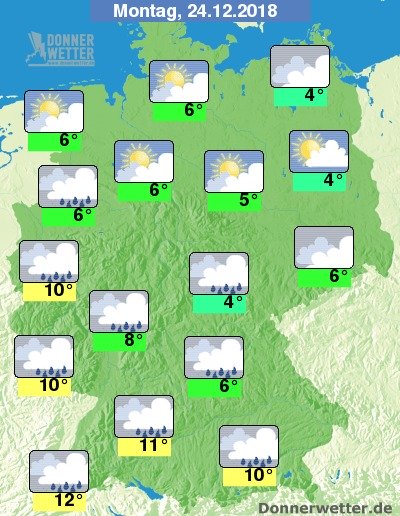 Am Montag halten sich über der Südwesthälfte der Republik dichte Wolken und es fällt wiederholt Regen. Dagegen ist es im Norden und Osten teils stark, teils auch gering bewölkt, dabei bleibt es trocken. Die Temperatur steigt auf 4 Grad in Vorpommern und bis 12 Grad im Breisgau.