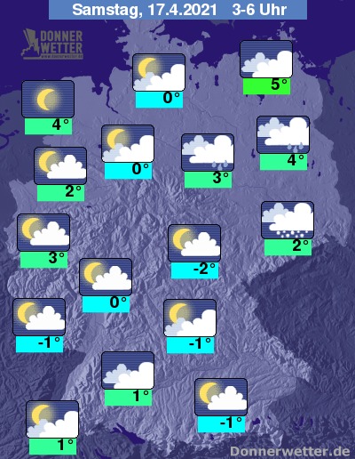 In der kommenden Nacht ziehen über den Osten dichte Wolken mit Schnee, Schneeregen oder Regen hinweg. Auch über der übrigen Nordosthälfte bleibt der Himmel meist bedeckt, jedoch fällt dazu kaum Regen oder Schnee. Über der Südwesthälfte der Republik zeigt sich der Himmel oft nur gering bis wechselnd, teils auch stärker bewölkt, dazu bleibt es trocken. Die Temperatur sinkt auf 5 Grad in Rostock und bis -2 Grad im Grabfeld.