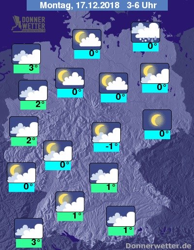 In der Nacht zum Montag fällt nordöstlich der Elbe noch verbreitet Schnee, Schneeregen oder gefrierender Regen, dabei besteht stellenweise hohe Glättegefahr! Im übrigen Bundesgebiet ist es teils stark, teils aufgelockert bewölkt, teils ist es neblig-trüb, dazu bleibt es aber weitgehend trocken. Die Temperatur sinkt auf 3 Grad in Emden und bis -1 Grad im Vogtland.