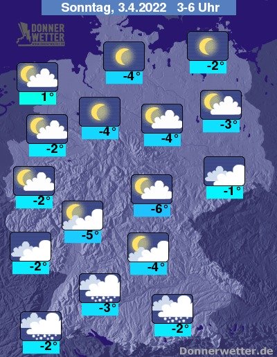 In der Nacht zum Sonntag fällt südlich des Mains unter dichten Wolken noch zeitweise Schnee. Im Norden ist es bereits meist locker bewölkt oder sternenklar. Über der breiten Landesmitte lockert und klart es ebenfalls häufig auf, dazu bleibt es trocken. Die Temperatur sinkt auf 1 Grad in Cuxhaven und bis -6 Grad in Jena.