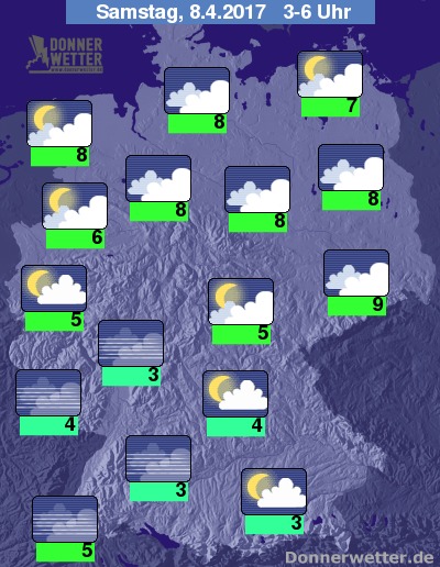 In der Nacht zum Samstag klingen die leichten Niederschläge im Osten nach und nach ab, hier und auch in der übrigen Nordosthälfte Deutschlands bleibt es bis zum Morgen weitgehend stark bewölkt, dazu dann jedoch trocken. Weiter nach Südwesten hin zeigt sich der Himmel verbreitet locker bewölkt und oft sternenklar, dazu bleibt es trocken. Die Tiefstwerte liegen bei 9 Grad in Dresden und etwa 3 Grad am Westerwald.