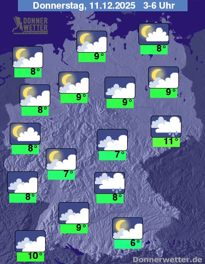 Am Donnerstag zeigt sich der Süden und Norden des Landes teils aufgelockert, zumeist jedoch bedeckt oder trüb. Über der breiten Landesmitte scheint dagegen zeitweise die Sonne, zum Teil ist es sogar heiter. Im Süden können zu Beginn noch letzte Tropfen fallen, im übrigen Land bleibt es aber trocken. Die Temperatur steigt auf 8 Grad im Grabfeld und bis 12 Grad am Oberrhein.