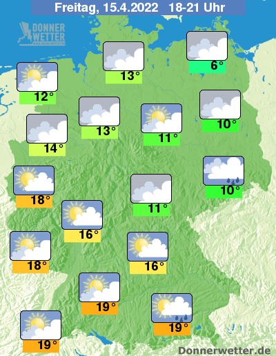 Heute Abend bleibt es über der Nordosthälfte weiterhin stark bis dicht bewölkt, Schauer bilden sich dabei aber nur noch selten. Im Süden und Westen ist es überwiegend heiter und teils sonnig, jedoch ziehen gebietsweise auch einige und vor allem an den Alpen auch dichte Wolken durch, hier sind einzelne Schauer möglich, sonst bleibt es trocken. Die Temperatur liegt bei nur 6 Grad auf Rügen, aber bis 19 Grad im Breisgau.