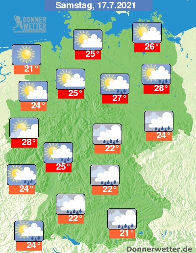Am Samstag scheint im Norden und Westen Deutschlands verbreitet die Sonne und es ziehen hier höchstens lockere Wolken durch, dabei bleibt es trocken. Im übrigen Bundesgebiet ist es dagegen überwiegend dicht, hier und da auch aufgelockert bewölkt, dazu können sich teils kräftige Schauer und Gewitter bilden. Die Temperatur steigt auf 21 Grad im nördlichen Emsland und bis 28 Grad im Rheinland.