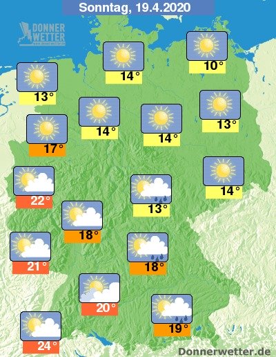 Am Sonntag bleibt es über der Nordhälfte sonnig, am Alpenrand und über dem Südosten ist es hingegen oft stark bewölkt und hier bilden sich zeitweise Schauer, lokal auch Gewitter. Im übrigen Land ist es locker bis wechselnd bewölkt und dazu trocken. Die Temperatur steigt auf 10 Grad an der Ostseeküste und bis zu 24 Grad in Freiburg.