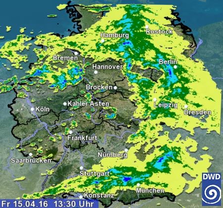 Auf dem Regenradarbild von heute Nachmittag 13:30 Uhr zeigen sich kräftige Regenwolken vom Norden bis in den Osten Deutschlands, sowie auch im Süden und Südosten. Hier fiel auch oft starker und teils langanhaltender Regen. Über der Westhälfte war es hingegen zum Großteil trocken und es bildeten sich nur lokale Schauer.