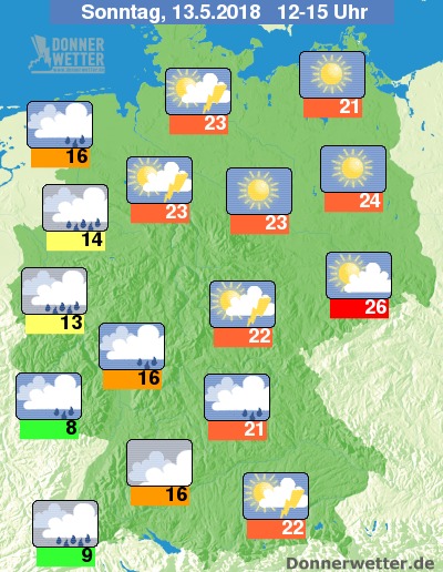 Heute Nachmittag bilden sich in einem breiten Streifen von Bayern bis hoch zur Nordsee gebietsweise Schauer sowie örtlich auch Gewitter. Südwestlich davon fällt unter dichten Wolken zeitweise Regen. Nordöstlich des Streifens scheint hingegen die Sonne von einem oft stahlblauen Himmel, hier bleibt es trocken. Die Temperatur liegt bei teils nur sehr kühlen 8 Grad am Pfälzer Wald und bis 26 Grad in Dresden.
