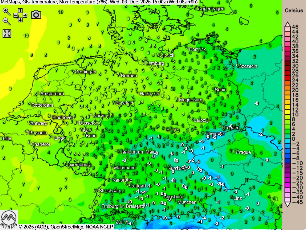 Die Temperatur- und Wetterkarte für Mittwochnachmittag (15:00 Uhr) nach GFS: