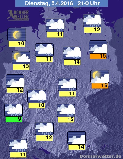 Heute Abend lockert der Himmel über dem Nordwesten und Westen Deutschlands immer weiter auf, hier bleibt es schon weitgehend trocken. In den übrigen Landesteilen ziehen hingegen überwiegend dichte Wolken durch, die zeitweise für Regen sorgen. Die Abendtemperatur liegt bei 16 Grad in Görlitz und um 9 Grad am Pfälzer Wald.
