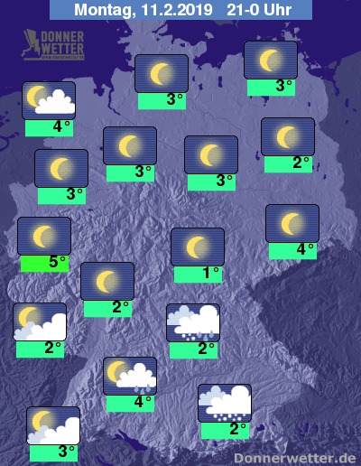 In den Abendstunden zeigt sich der Himmel zunächst überwiegend locker oder aufgelockert bewölkt, im Nordseeumfeld ist es teils auch sternenklar. Im Süden und Südosten sind die Wolken auch dichter und zeitweise fällt Regen, Schneeregen oder Schnee.