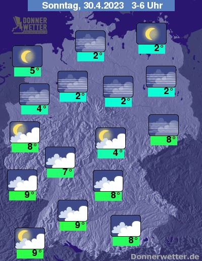 In der Nacht zum Sonntag klart der Himmel im Norden und im Nachtverlauf über der gesamten Nordhälfte des Landes auf. Weiter nach Süden bleibt es hingegen meist bei dichten Wolken. Bei Tiefstwerten von 9 Grad in Stuttgart und 2 Grad in Hamburg bleibt es landesweit trocken.