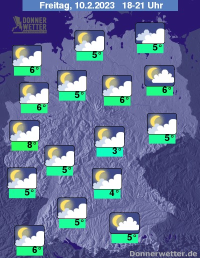 In den Abendstunden zeigt sich der Himmel meist stark bewölkt oder es ist bedeckt. Im Norden und Osten kann in den nächsten Stunden etwas Regen oder Sprühregen fallen (in den Mittelgebirgen örtlich auch Glättegefahr!), sonst bleibt es meist trocken.