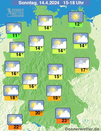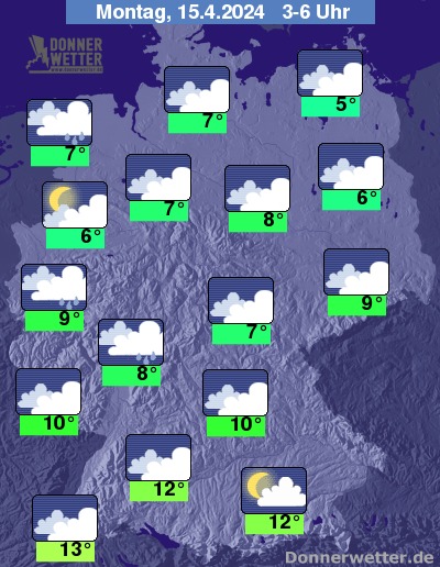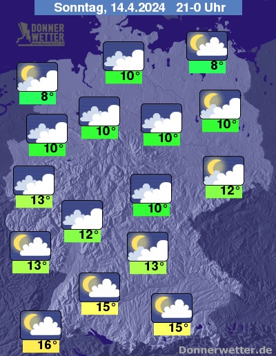 Die Temperaturen gehen in der Nacht zurück auf Werte um 13 Grad am Oberrhein und 5 Grad an der Ostseeküste.