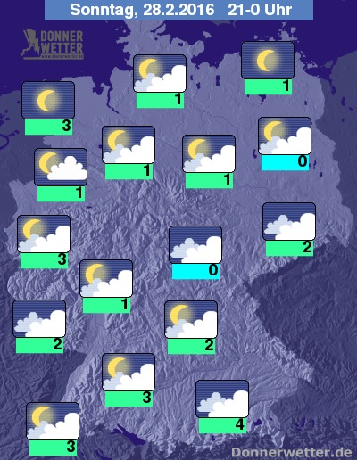 Heute Abend bleibt es im Norden meist locker bewölkt, im Küstenumfeld weitgehend sternenklar. Weiter nach Süden hin werden die Wolken dichter und über der Südhälfte ist es insgesamt auch überwiegend stark bewölkt, es bleibt aber praktisch landesweit trocken. Die Abendtemperatur liegt bei 3 Grad in Freiburg und um 0 Grad im nördlichen Brandenburg.