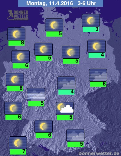 In der folgenden Nacht ziehen hier und da mal lockere Wolken durch, zum Großteil zeigt sich der Nachthimmel jedoch sternenklar, dazu bleibt es trocken. Die Temperatur sinkt auf 8 Grad in Köln und bis 3 Grad in Vorpommern.