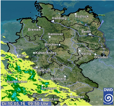Erste Niederschlagsgebiete ziehen aktuell bereits über die Süd- und Westhälfte Deutschlands hinweg.