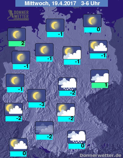 In der kommenden Nacht ziehen über Bayern, Thrüringen und Sachsen meist dichte Wolken hinweg, die hier gebietsweise für Schneefall sorgen. Dabei besteht Glättegefahr! Sonst zeigt sich der Himmel über dem Land jedoch überwiegend sternenklar, dazu bleibt es trocken. Die Temperatur sinkt auf 2 Grad an der Nordsee und auf frostige -3 Grad am Taunus.