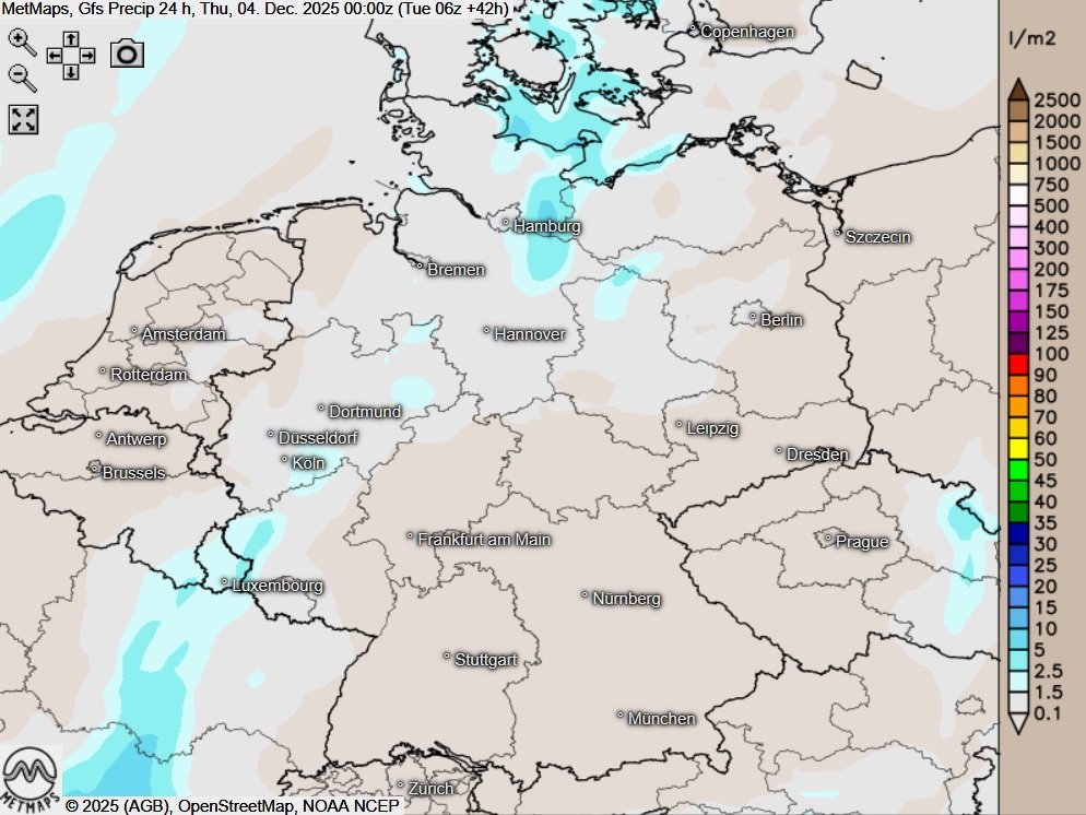 Die Strömungs- / Temperatur- und Wetterkarte für Dienstagfrüh (06:00 Uhr) sowie die 24-Stunden-Regenmengen für Dienstag nach GFS: