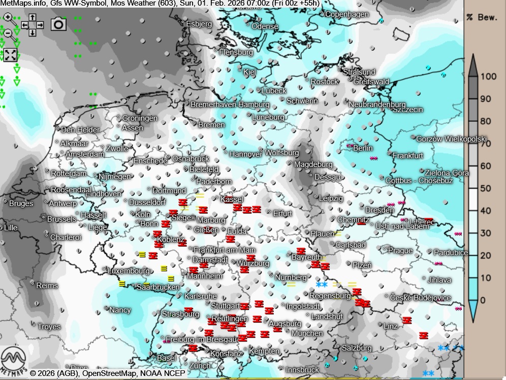 Die Temperaturen erreichen im Norden und Osten Höchstwerte um -7 und 0 Grad, entlang des Rheins werden am Nachmittag bis 10 Grad erreicht.