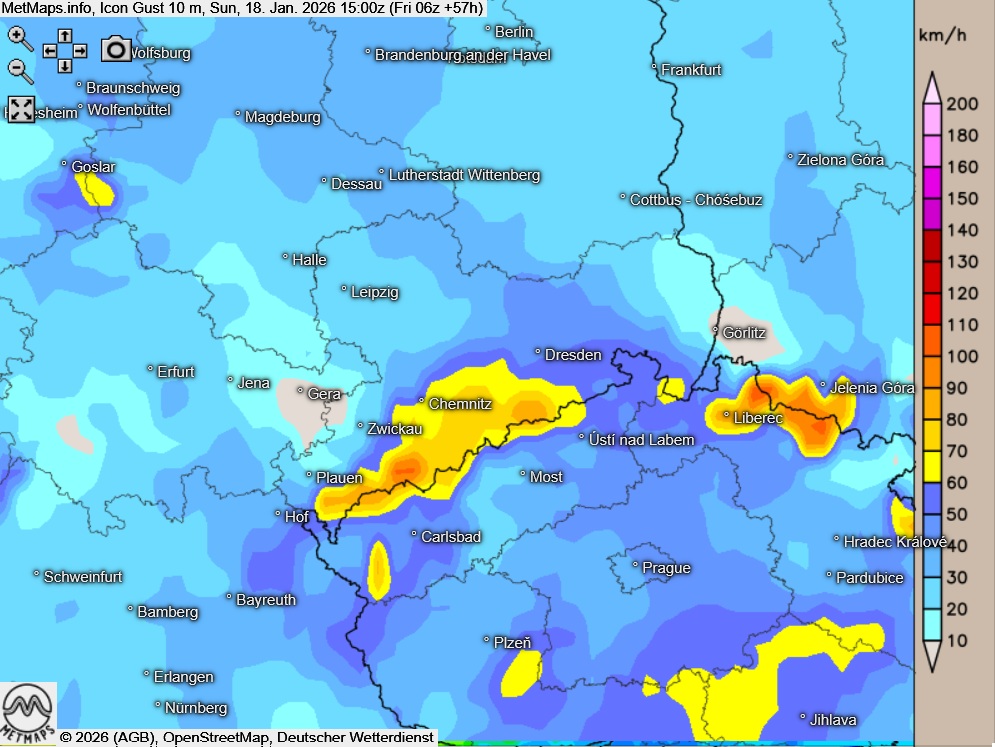 Die Temperatur- und Wetterkarte sowie die Böenkarte für den Südosten für Sonntagnachmittag nach ICON: