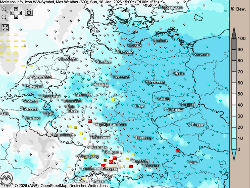 Am Sonntagnachmittag kann sich über dem Süden und Südwesten weiterhin zäher Nebel oder Hochnebel halten. In den übrigen Landesteilen zeigt sich der Himmel teils heiter bis wolkig, vor allem über der Osthälfte scheint die Sonne auch von einem wolkenlosen Himmel.