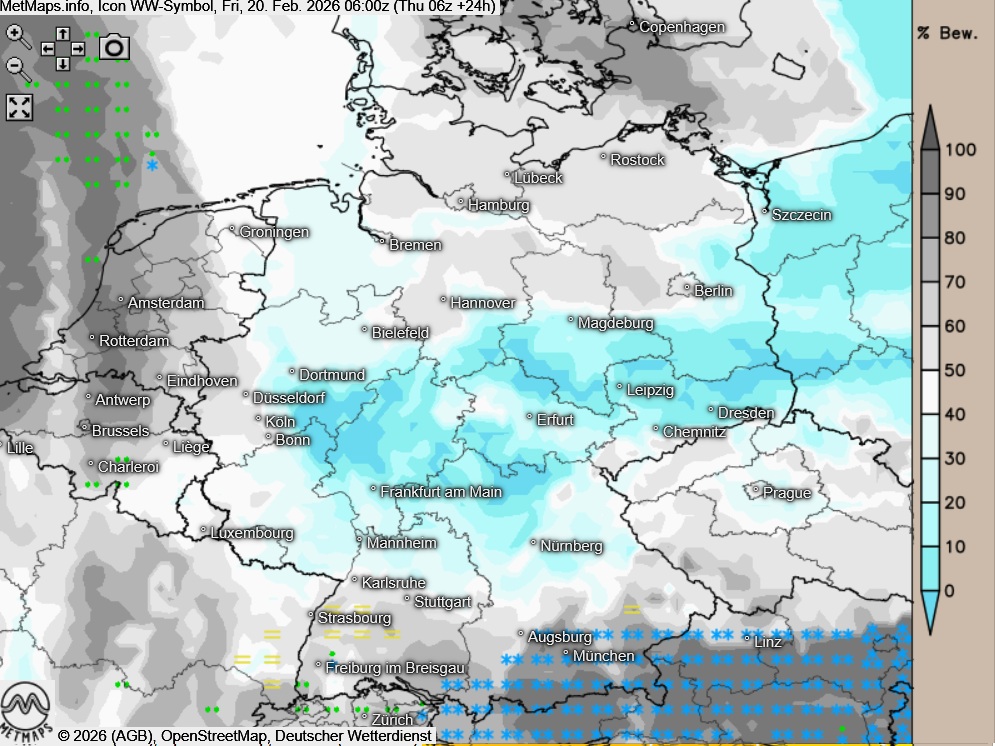 Am Donnerstagnachmittag bleibt es im Norden und Osten Deutschlands bei wechselnder Bewölkung weitgehend trocken. Von den Alpen breiten sich im Nachmittag teils kräftige Niederschläge aus, die bis in tiefe Lagen auch in Schnee übergehen können. Auch am Abend ist vor allem in Alpennähe noch kräftiger Schneefall möglich.
