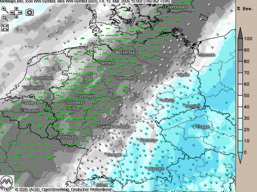 | Der Norden und Osten liegt weiterhin im Einflussbereich kalter Kontinentalluft, während das Wetter im Süden und Westen von atlantischen Tiefausläufern und milder Meeresluft bestimmt wird. |