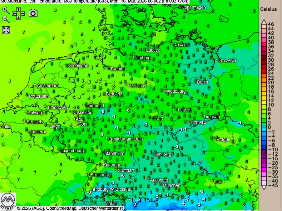 Die Wetter- und Temperaturkarte für Montagfrüh (06:00 Uhr) sowie die 24-Stunden-Regenmengen für Montag nach ICON: