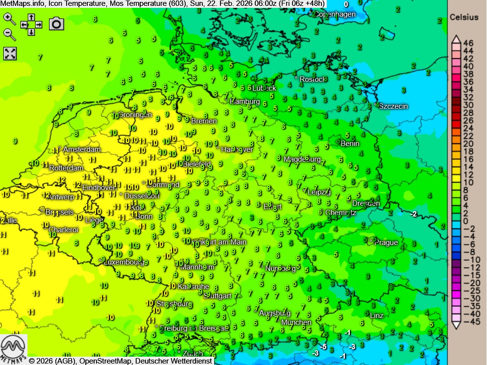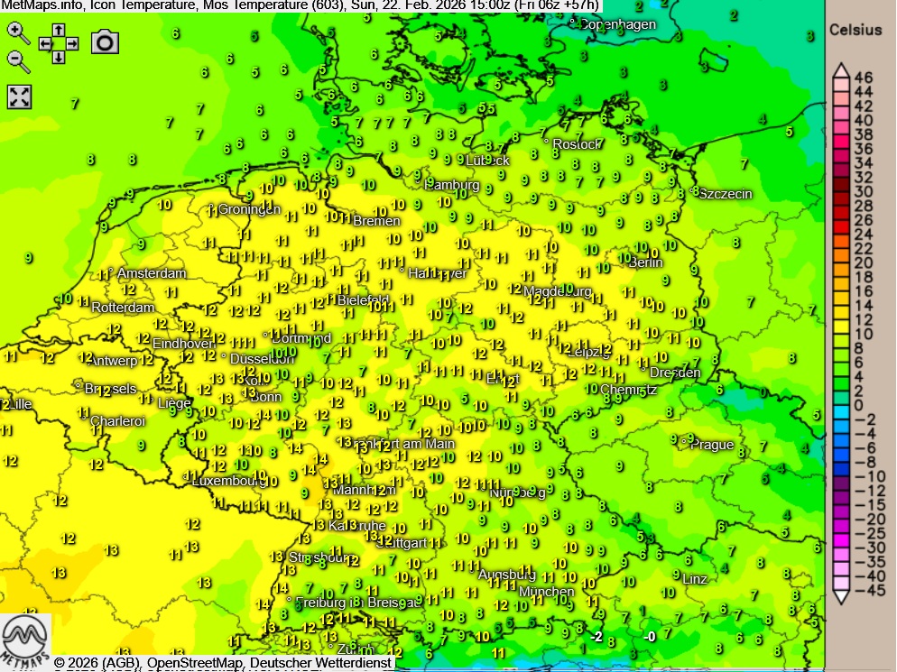 Die Temperaturen erreichen am Nachmittag Werte um 5 Grad im Nordosten und um 15 Grad am Oberrhein.