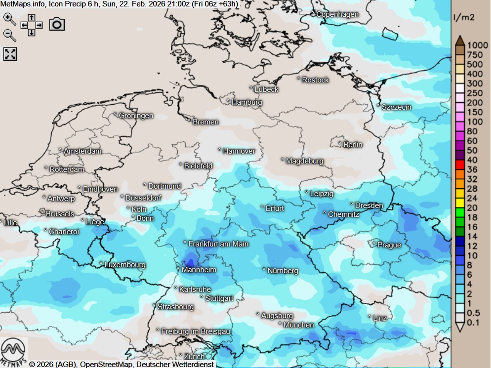 Die Wetter- und Temperaturkarte für Sonntagnachmittag (Regen grün) sowie die Sechs-Stunden-Regenmengen bis 21:00 Uhr nach ICON: