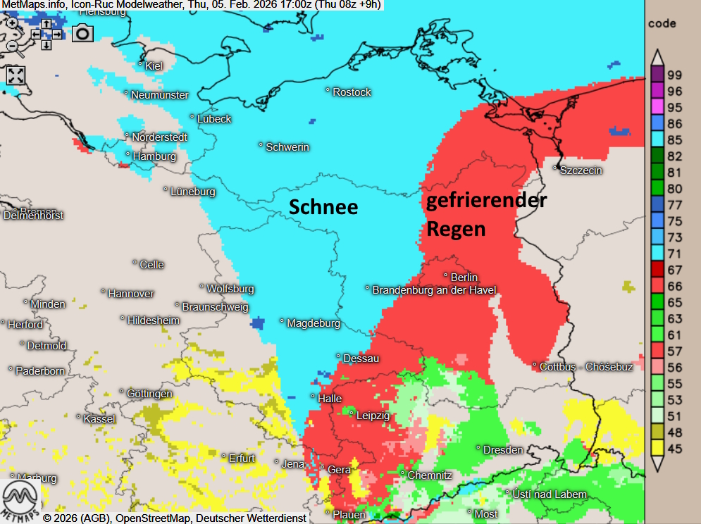 Am Donnerstag muss im Nordosten gebietsweise mit teils ergiebigen Schneefällen gerechnet werden; im Osten besteht Glättegefahr durch gefrierenden Regen. In den übrigen Landesteilen bleibt es heute bei einem Mix aus Sonne und Wolken weitgehend trocken.