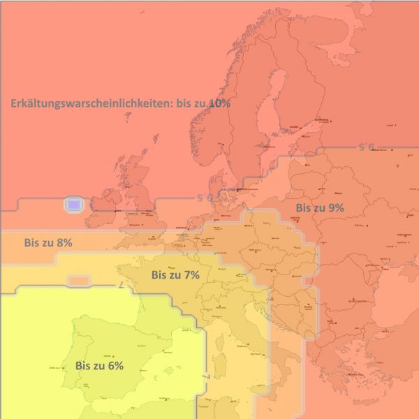 Die Erkältungswahrscheinlichkeit in der nächsten Woche in Europa. Milde Luft sorgt in Mitteleuropa für eine geringe Schnupfenwahrscheinlichkeit. Für Skandinavien und den Balkan und die Türkei werden hohe Erkältungsrisiken erwartet.
