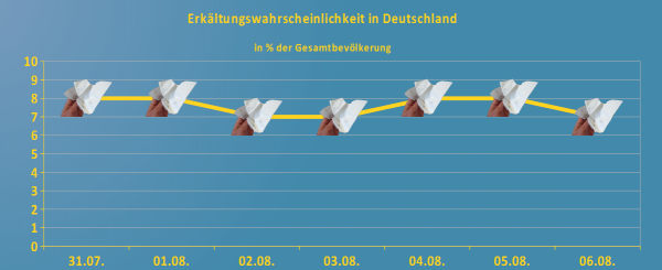 Mit für Anfang August recht hohen Erkältungs- und Grippezahlen müssen wir uns in den kommenden Tagen arrangieren. Das wechselhafte Wetter sorgt in der ersten Woche des neuen Monats dafür, dass um 7-8% der Bevölkerung von Husten, Schnupfen oder sogar einer waschechten Sommergrippe betroffen sind.