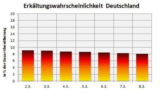Mit der Wetterbesserung durch ein Hochdruckgebiet und mit einhergehenden Tagestemperaturen um 10 Grad C sinkt die Grippe- und Erkältungswahrscheinlichkeit im Laufe der Woche knapp unter die 10-Prozent-Marke.