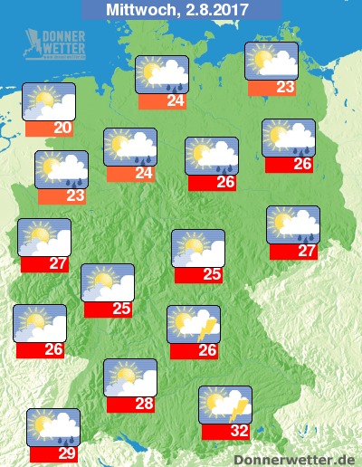 Gebietsweise schien am Mittwoch (09.08) längere Zeit die Sonne. Vor allem über NRW und im Süden dominierten aber auch zeitweise die Wolken. Die Höchsttemperaturen lagen meist bei warmen 20 bis 26 Grad C. Rund um Berlin wurden sogar bis 28 Grad C erreicht. Gegen Abend entwickelten sich im Süden teils gewittrige Regengüsse, die sich in der Nacht nach Norden ausbreiteten.