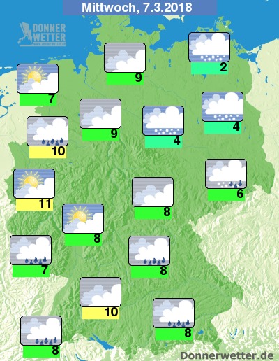 Im Osten und Nordosten schneite es am Mittwoch (07.03.) bei 0 bis 2 Grad C für längere Zeit, stellenweise fielen über 5 Zentimeter Neuschnee. Tagsüber ging der Schnee jedoch teilweise in Regen über. Auch sonst dominierten meist die Wolken und die Sonne kam eher selten zum Zuge. Örtlich regnete es etwas oder es gingen Schauer nieder. Der Wind frischte gebietsweise auf. Die Höchsttemperaturen lagen meist zwischen 3 und 12 Grad C.