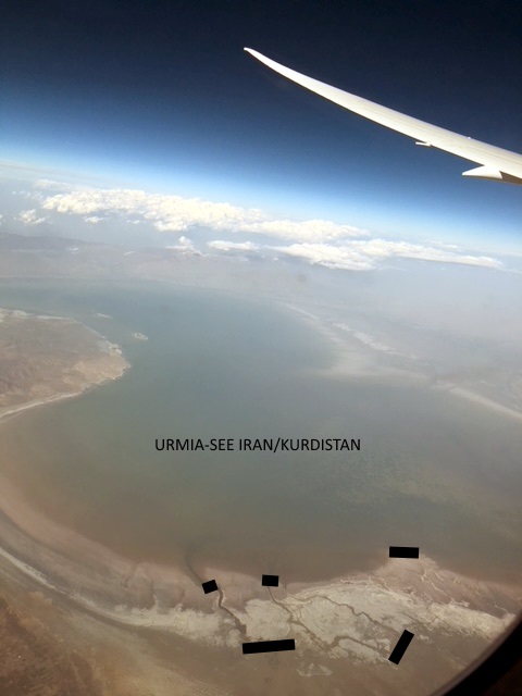 Das Bild von Ende März 2018 aus dem Flugzeug in 12 km Höhe zeigt den Verlust seit dem Jahr 2013. Vermutlich wird der See bis 2030 fast vollständig verschwunden sein. Jetzt schon gibt es Wind und Salzstürme mit verheerenden Folgen für die Umgebung.