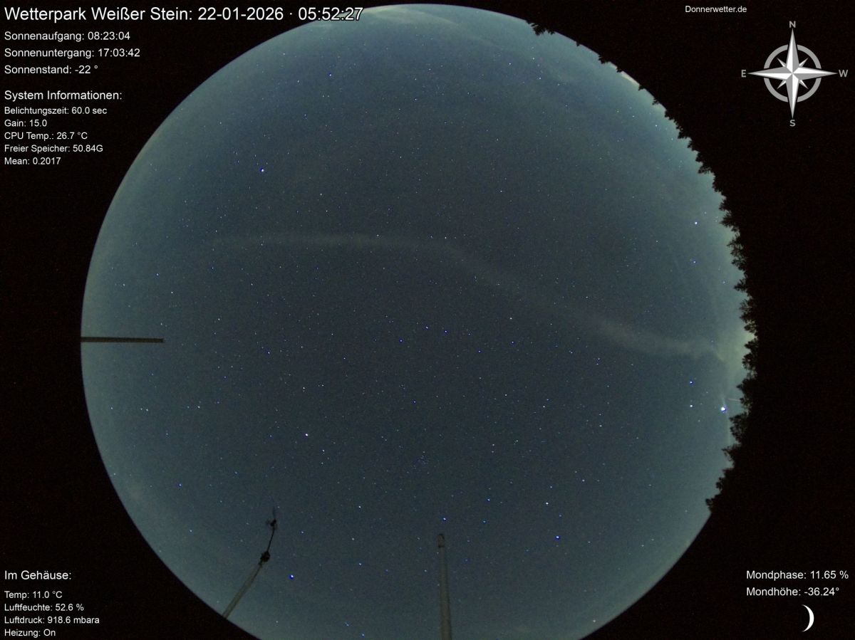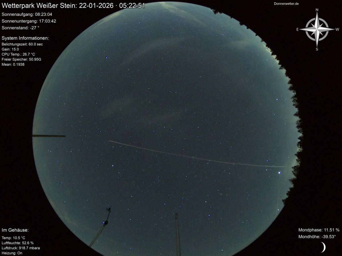 Wie lange sich Kondensstreifen in der Atmosphäre halten, lässt sich an diesem Beispiel besonders gut beobachten: Eine Boeing 777-369(ER) der Kuwait Airways (Flug KAC 118) startete gestern (21. Januar 2026) um 16:55 Uhr Ortszeit in New York und überflog heute Morgen um 05:20 Uhr (22. Januar 2026) den donnerwetter.de Wetterpark in der Eifel.