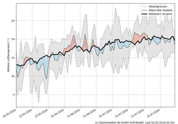 Unsere aktuellen Langfristmodelle berechnen den Mai für den Osten des Landes aktuell als durchwachsen. Die mittleren Lufttemperaturen liegen bis auf wenige Ausnahmen unter dem langjährigen Mittel. Bis auf eine längere sonnige Phase in der ersten Dekade ist es zudem zu sonnenarm. Bei den Niederschlagssummen gibt es dagegen zur Zeit noch keinen eindeutigen Trend.